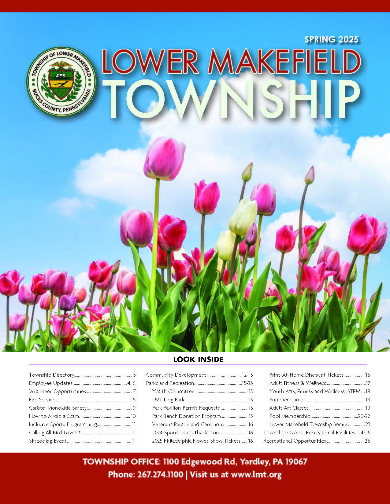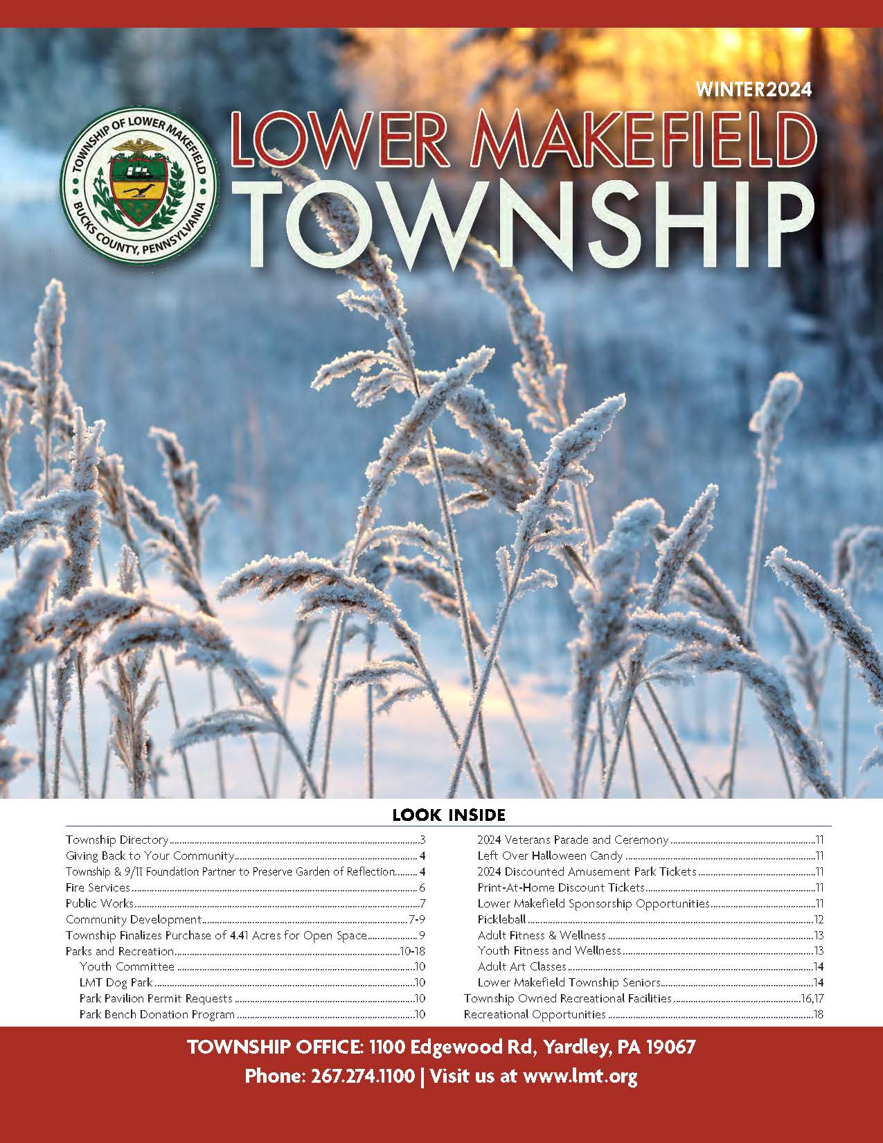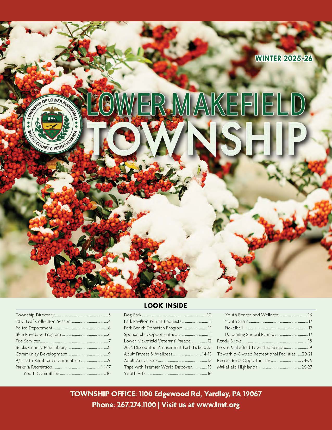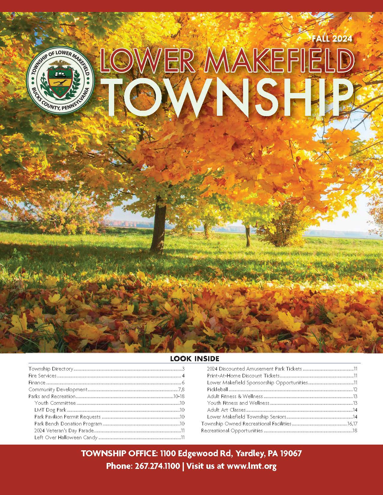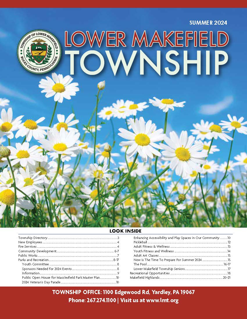 Home InformationAbout UsBird Town PennsylvaniaCommunity CenterFee ScheduleFlood Information & InsuranceMakefield Highlands Golf CourseProposed 2025 Road ProgramPublic SafetySeniorsThe Pool at LMTTownship NewslettersUtilitiesYard Waste Drop-Off InformationWaste & Recycling Information Township Newsletters Winter 2025 Fall 2025 Summer 2025 Spring 2025 Winter 2024 Fall 2024 Summer 2024 Spring 2024 Winter 2023 Summer 2023 Spring 2023 Winter 2022-2023 Fall 2022 Winter 2021-2022 Fall 2021 Summer 2021 Summer 2020 Spring and Summer 2020 2019-2020 Fall and Winter 2019 Spring and Summer Summer 2018 2018 Fall and Winter Information About Us Lower Makefield Township Population & Census Data New Resident Information Pennsbury School District Environment Transportation Additional Resources Library Bird Town Pennsylvania Community Center Fee Schedule Flood Information & Insurance Makefield Highlands Golf Course Proposed 2025 Road Program Public Safety Yardley-Makefield Emergency Unit ReadyBucks Emergency System Neighborhood Watch Program Animal Control & Dog Licenses Prescription Drug Disposal PAStop: Prescription Drug Abuse Prevention Seniors The Pool at LMT Township Newsletters Utilities Yard Waste Drop-Off Information Waste & Recycling Information Lower Makefield Township 1100 Edgewood Road Yardley, PA 19067 Phone: 267-274-1100 admin@lmt.org Hours Monday-Friday: 8:00 am - 4:30 pm View Contacts & Directory